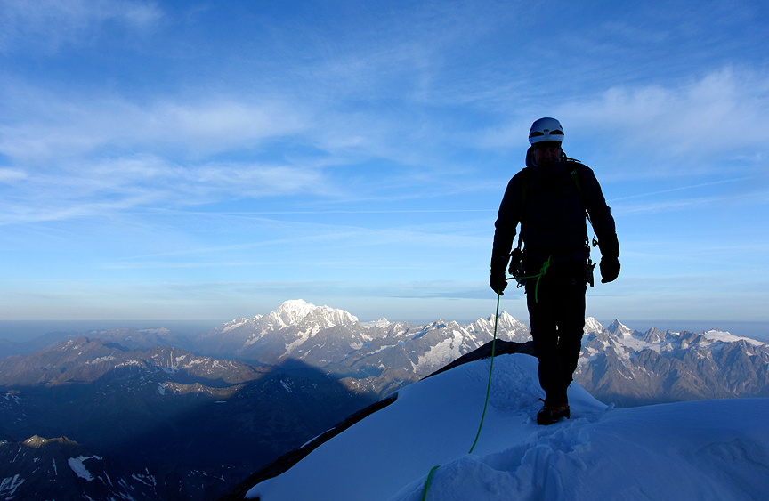 After what seems like miles of 45 degree frozen snow, we arrive at the final step of the Meitin Ridge. Mont Blanc in the background. |