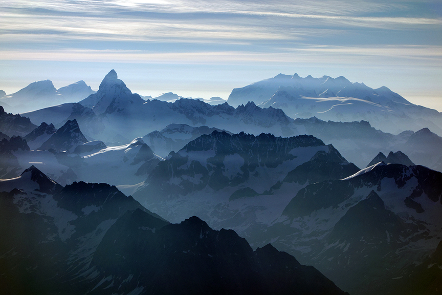 The view to the east from the summit of the Combin de Grafeneire. The distinctive shape of the Matterhorn is easy to identify. The Monte Rosa group is the broad series of summits on the right. |