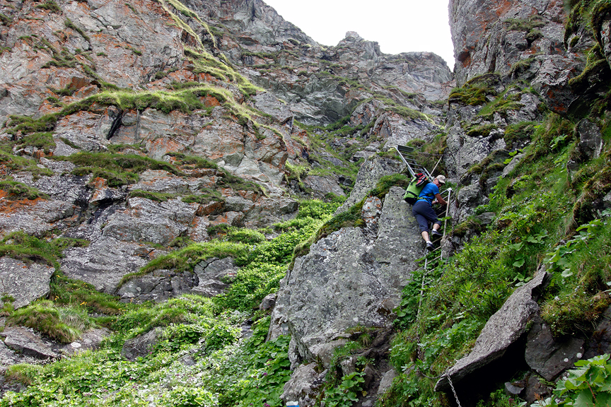 Negotiating the ladders on the "alpine variation" of the train into (or, in our case, out from) the hut. |