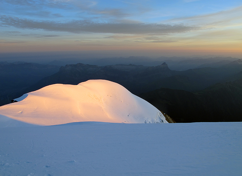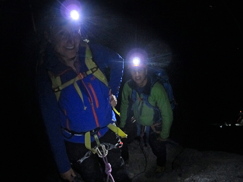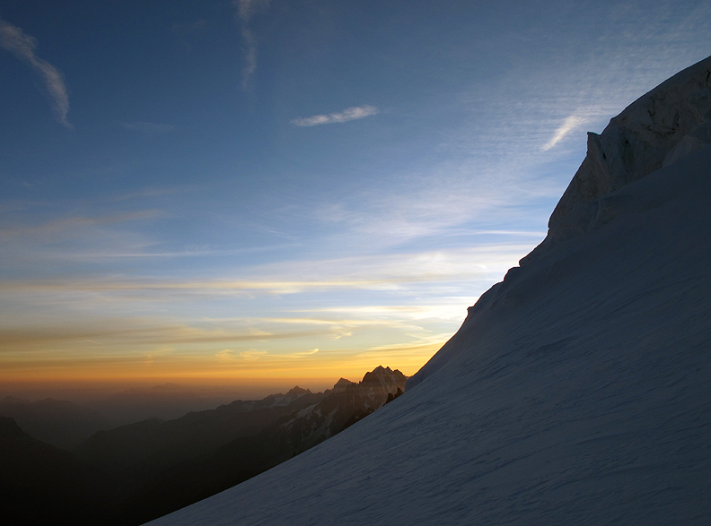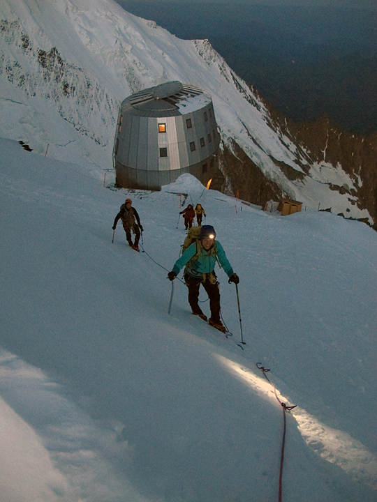 From Switzerland we returned to Chamonix, for our attempt on Mont Blanc. Starting out by headlamp in the wee hours, from the Tête Rousse hut. |