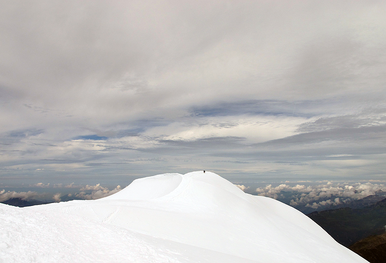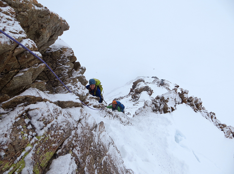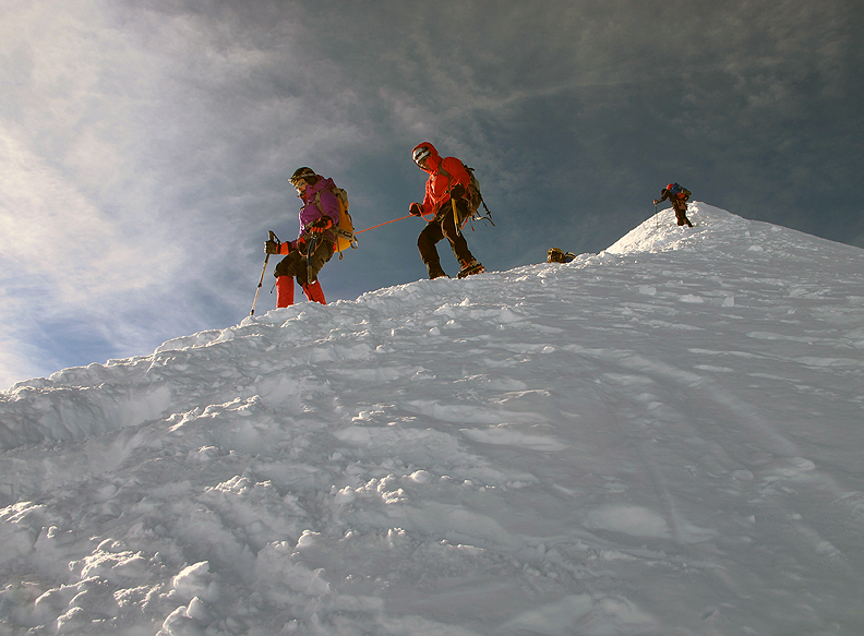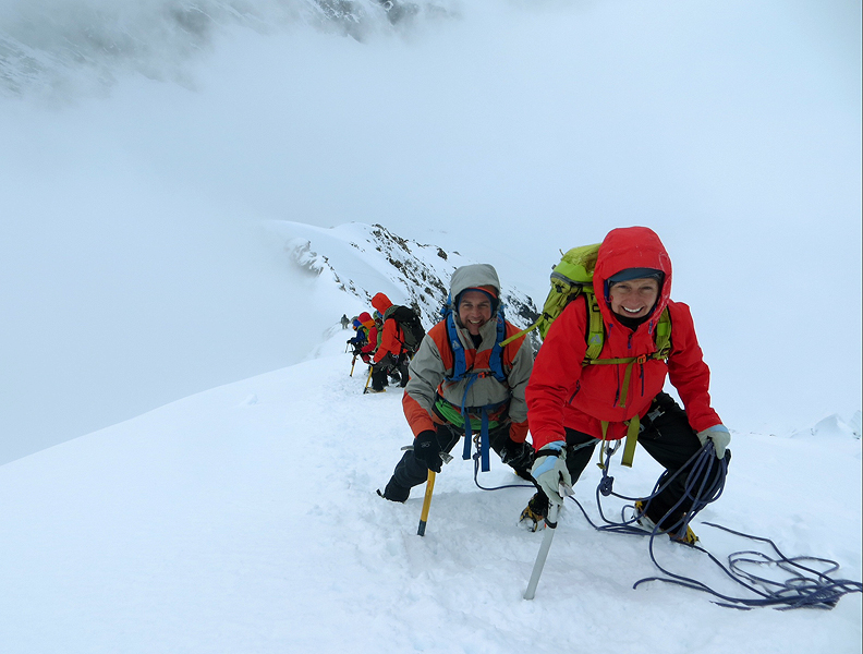 The following morning was indeed good enough for climbing. The steep snow just below the summit ridge here. |