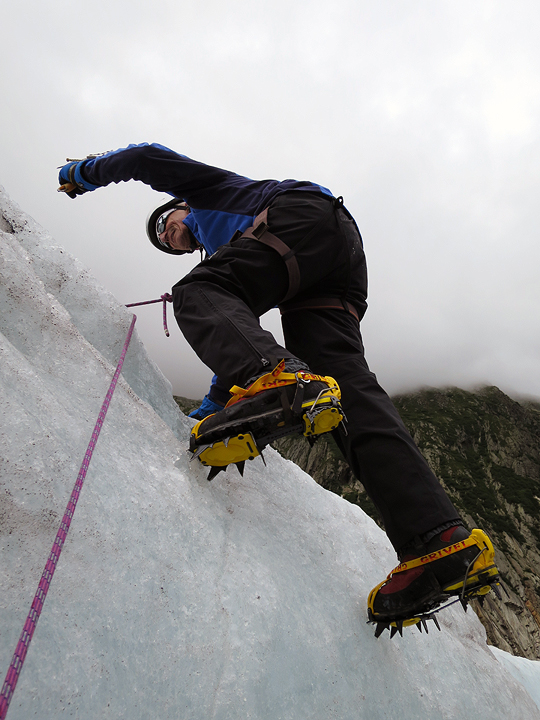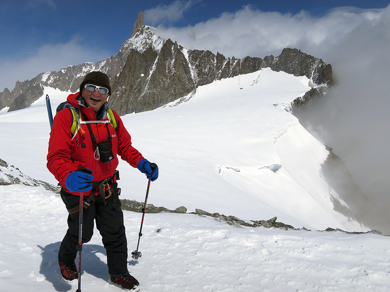 A couple of years ago, John Price came from his home in Western Australia, along with his wife, to Chamonix for a holiday. From the Aiguille du Midi he looked out across the Géant glacier and thought he would love to experience being out there in the ice and snow of a big glacier. This two days with Kathy was his fulfillment of that intention. |