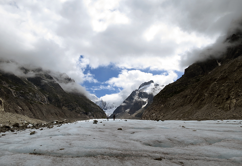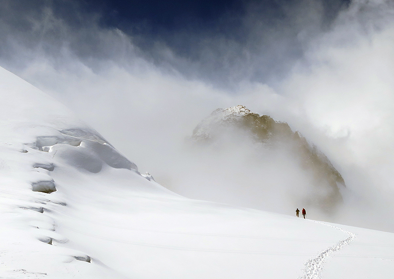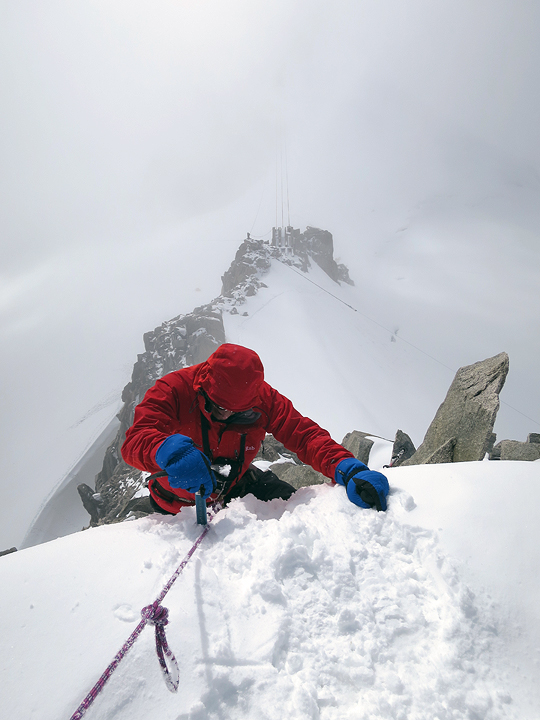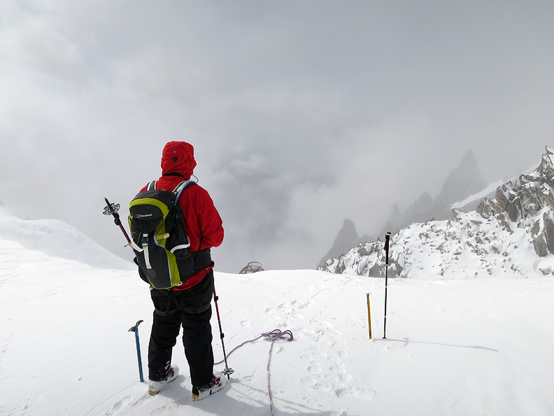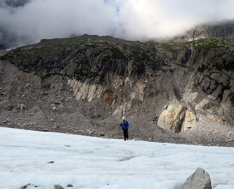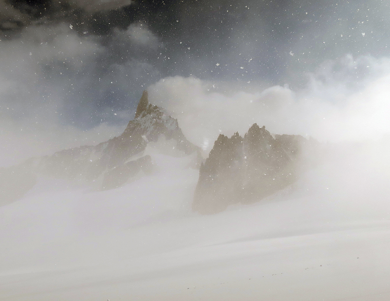 As we began our glacier walk, we did begin to see the first glimpses of the sun breaks we were hoping for. Still snowing, but the Dent du Géant and the Aiguilles Marbrées make a tantalizing appearance. |