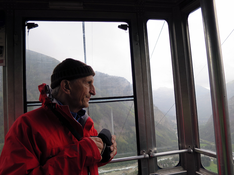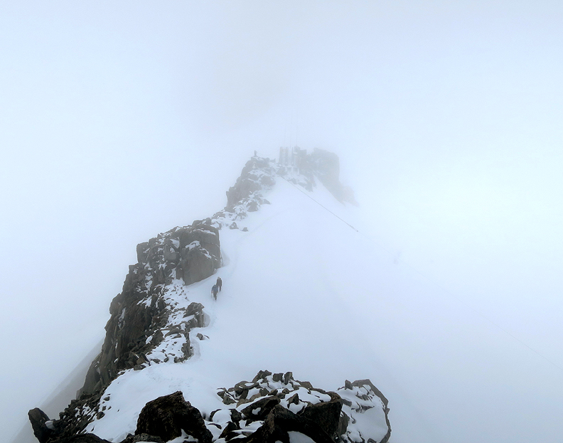 The following day, the forecasters backed off on their optimistic view, and it was quite rainy in Chamonix. We headed through the tunnel hoping for better conditions on the Italian side. It was ... a bit better! still raining, but only lightly. We headed up to Point Helbronner in hopes of sun breaks. |