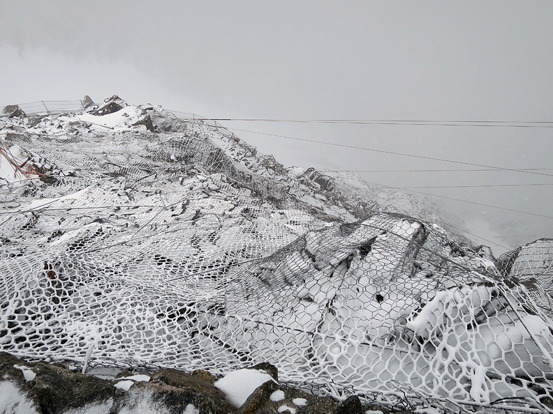 The area around the top station is a true construction site these days, as the new lift is in its last stages of construction. The jungles of wires looked intriguing in the fog and new snow. |