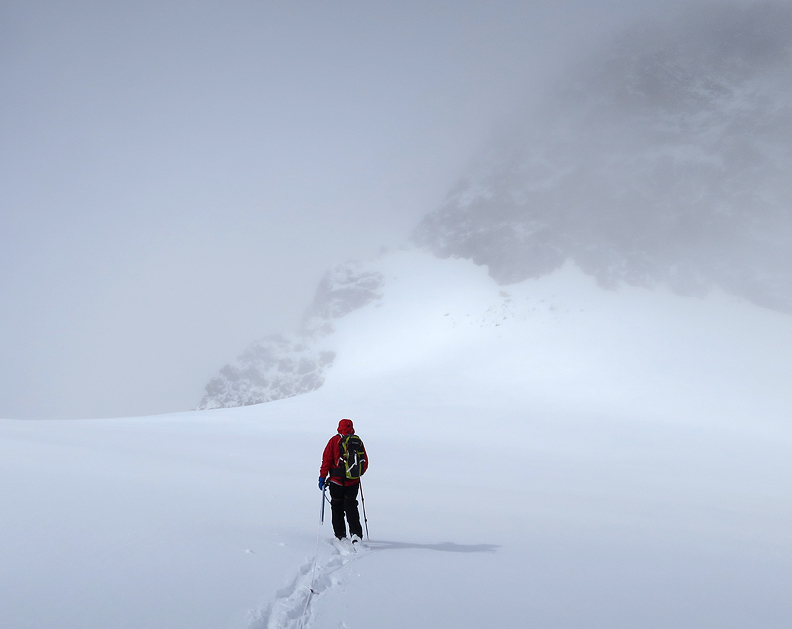 The view up toward the Grandes Jorasses, looking wintry in a fresh heavy dusting of snow. Although it was cloudy all around us, the sun lingered here in this little spot. |