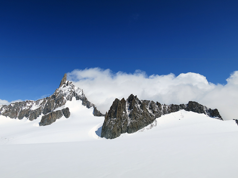 The sun was out for real as we headed back to the cable car. The Dent du Géant looking very wintry now. |