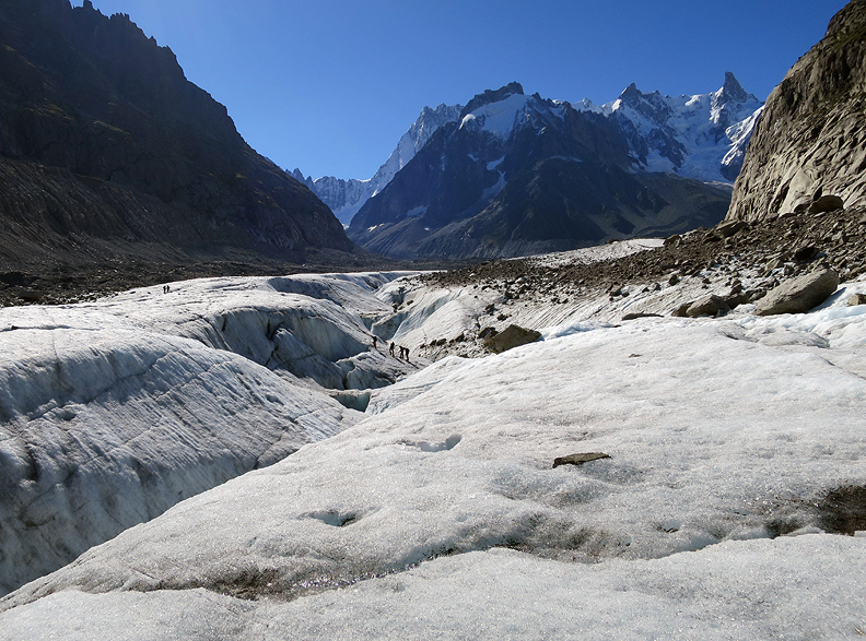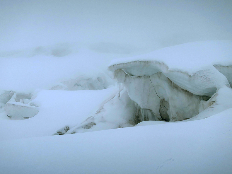 We did some snow climbing and self-arrest practice, before heading back across the Vallée Blanche. As we walked through the crevasse of the Géant glacier, the views were more mysterious than expansive. |