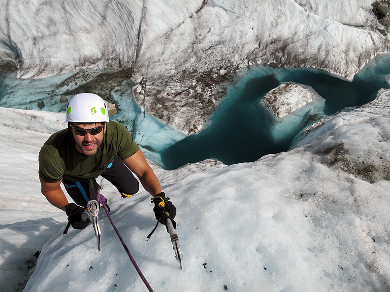 The weather was perfect, sunny and mild. We hiked to a melt-water carved ice canyon where we found walls of varying steepness and length. |