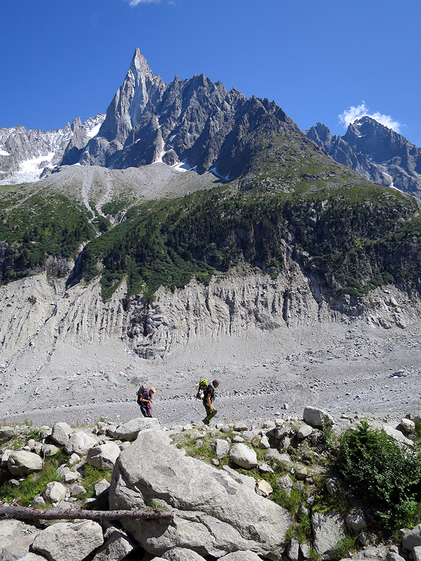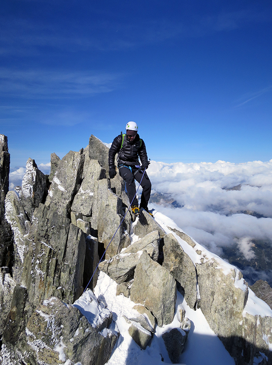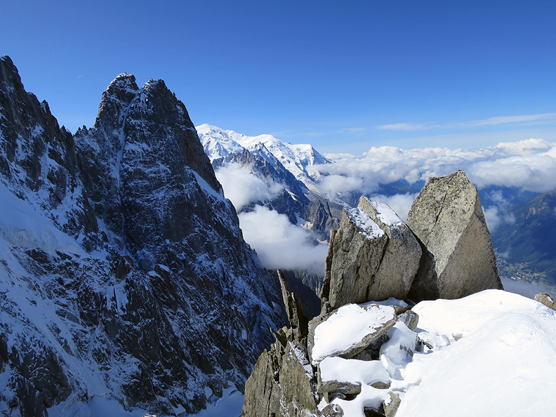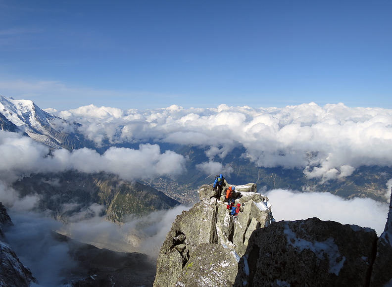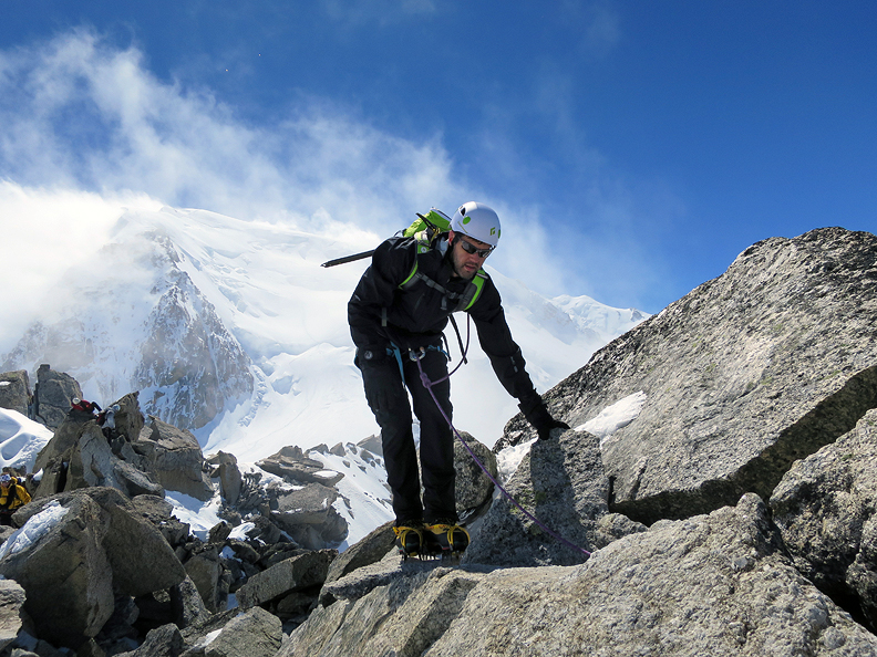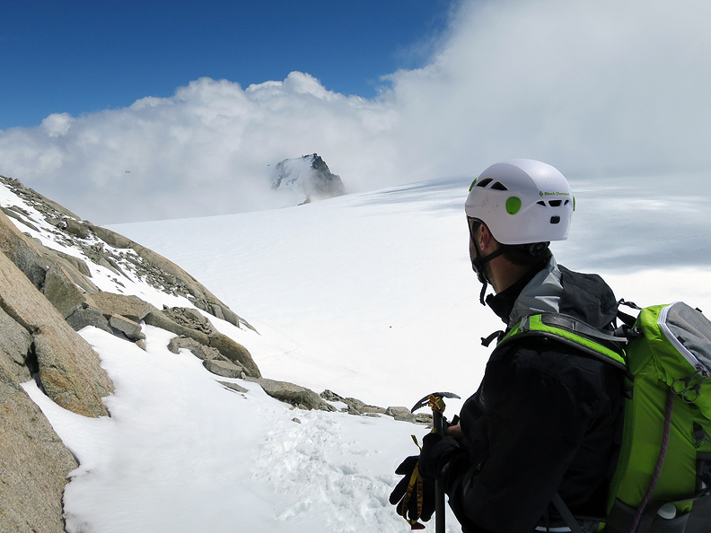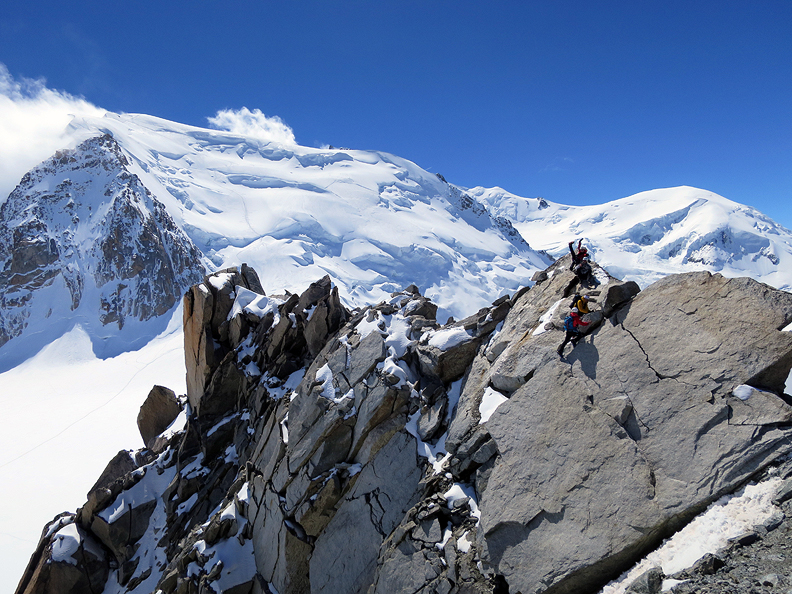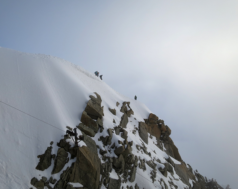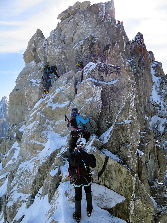 On our last day, we put it all together on a climb of the Petite Aiguille Verte. The weather looks perfect, but a freezing stiff breeze kept the crowds down (relatively speaking). |