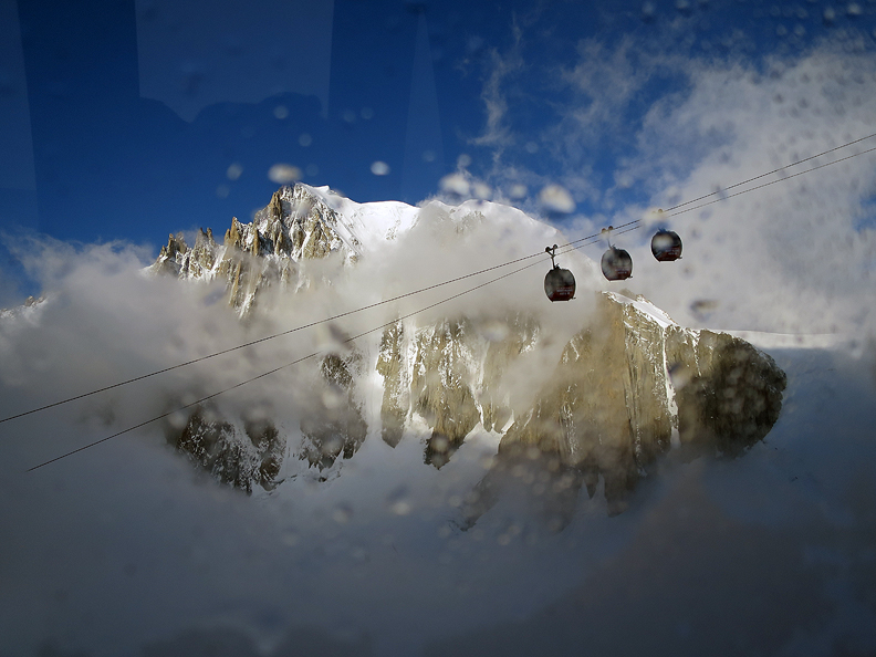 The next day we wanted to do some snow climbing and glacier travel work. We rode up to the Aiguille du Midi, and then across on the Panoramic to Point Helbronner on the Italian border. We caught glimpses of climbers descending the Aiguille du Midi ridge in the in-and-out mists. |