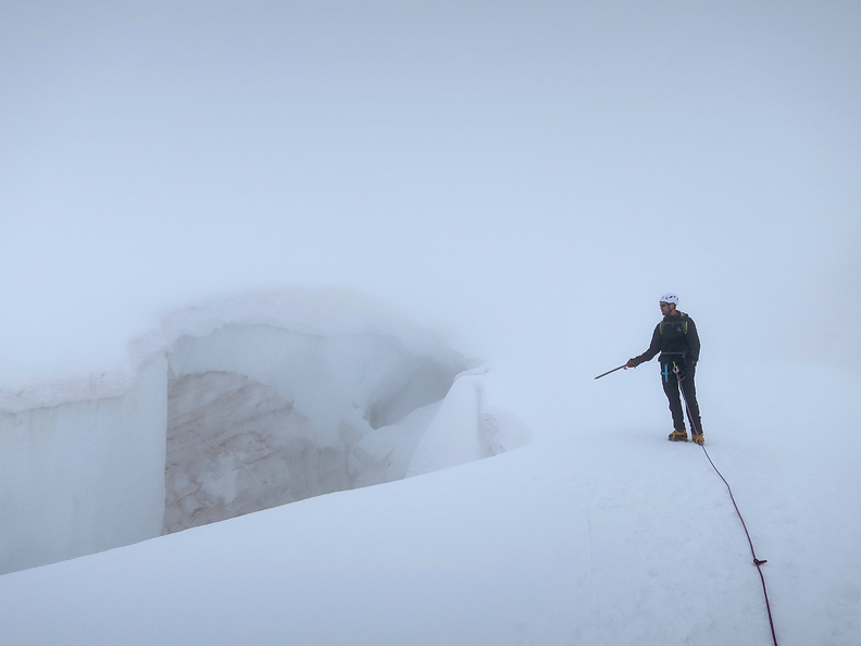 After a break at the hut, we climbed the un-nerving snow ridge back to the lift station, in a freezing mist. What we can't see won't hurt us, right? Zack drawing a breath as the going gets easier again near the end. That's not premature grey, that's rime ice in his hair. |