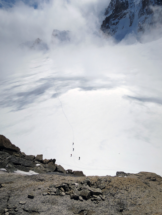Enjoying the play of cloud shadows on the glacier, as we begin our traverse. |