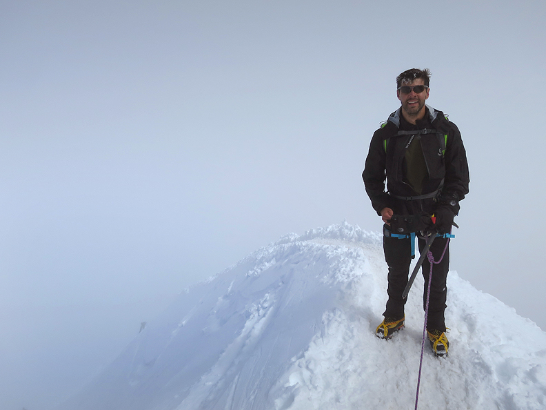 On the narrow summit block, even two is a crowd. Zack poses for a photo before we beat a hasty retreat. |
