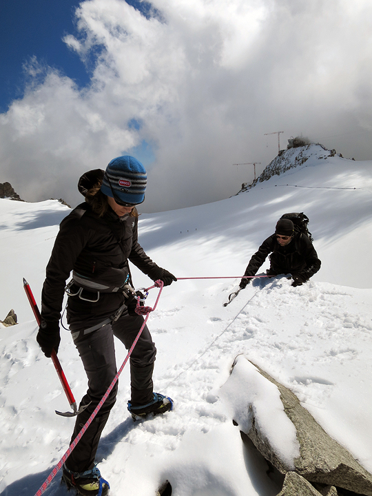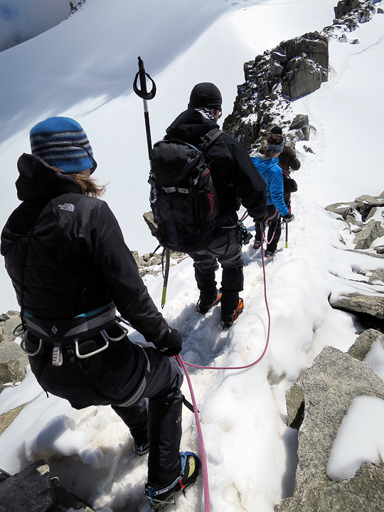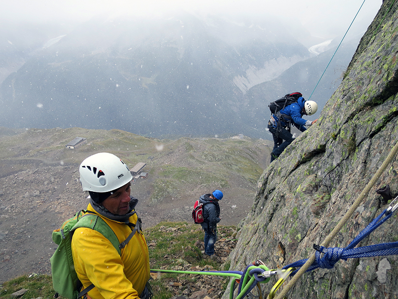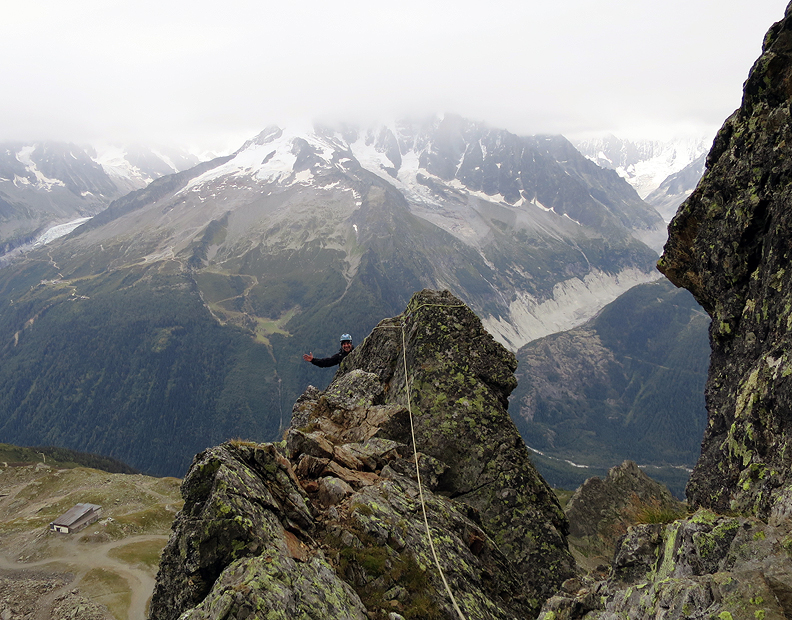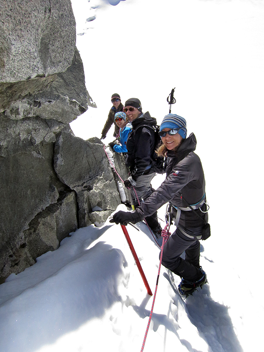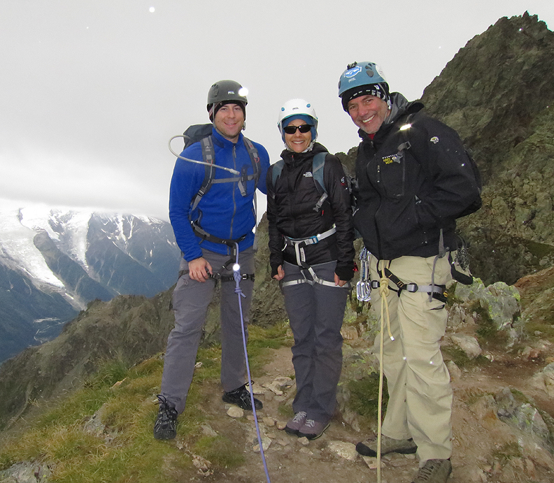 Our first day, we spent with Jack, Gina, and Rob (right to left) in the Aiguilles Rouges, climbing a rock route called Mani Puliti. Our weather was not ideal, quite wintry in fact! But we achieved our objective and had a good time all the same. |