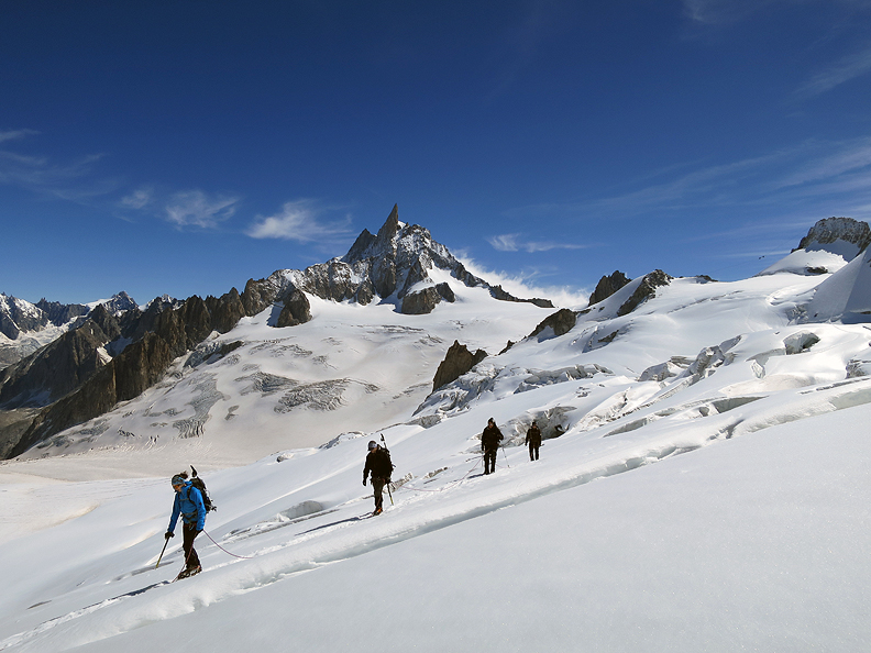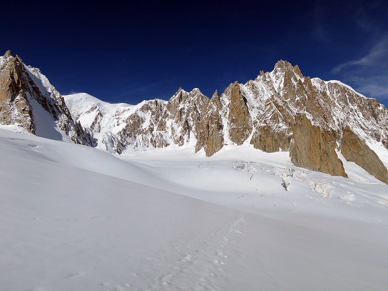 The Dent du Géant in the background. Our departure point on the far right of this photo shows us how far we've come. |