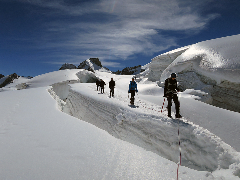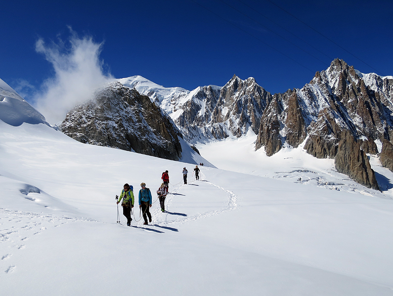 On our second day out with the group, we were joined by Rob (far left) and Mel (next to him) for a wander across the Vallée Blanche. We drove through the Mont Blanc tunnel to begin and end on the Italian side. |