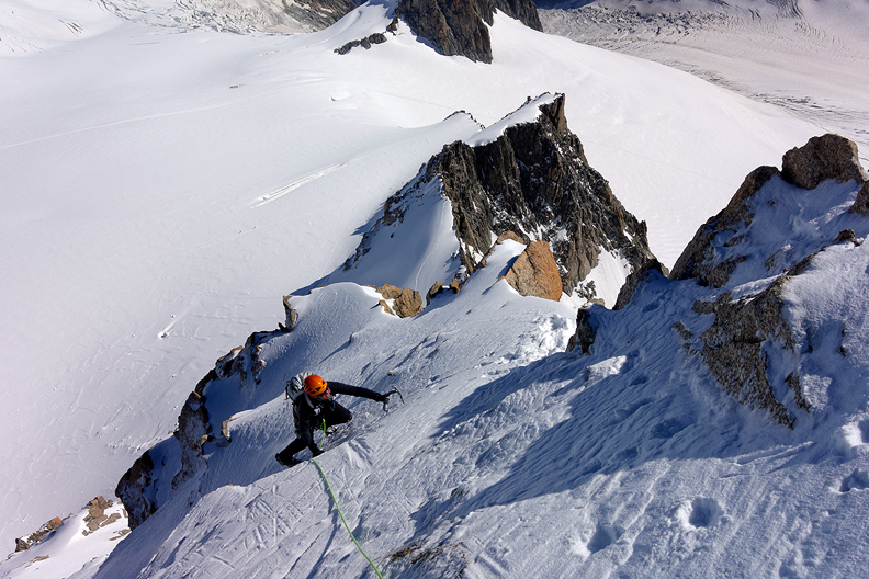 Climbing along the sharp ridge of the Entreves. Almost to the summit. |