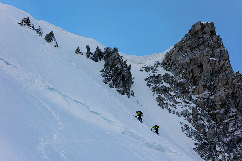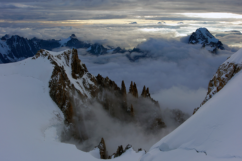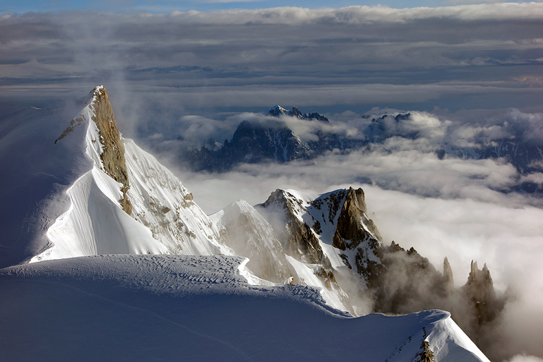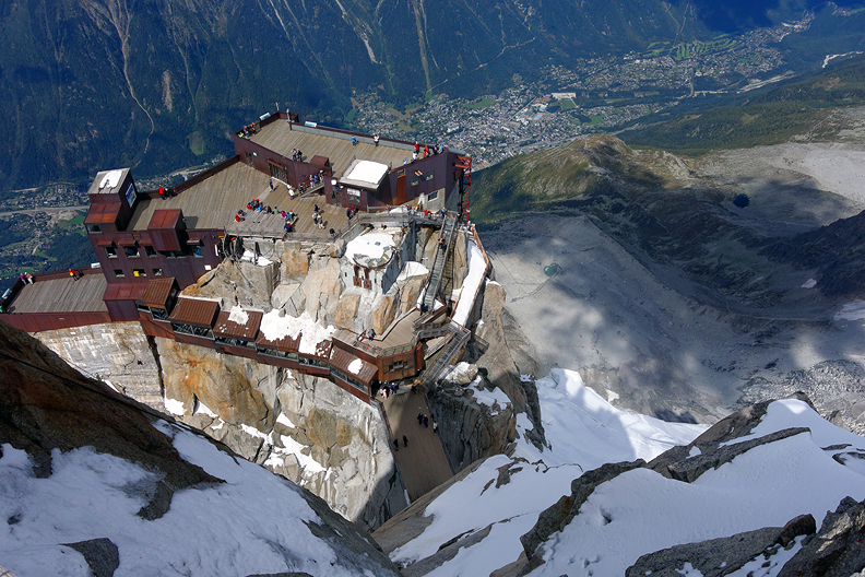 Looking down to the Piton Nord on the Aiguille du Midi, and then to Chamonix, almost 3000 meters below. |