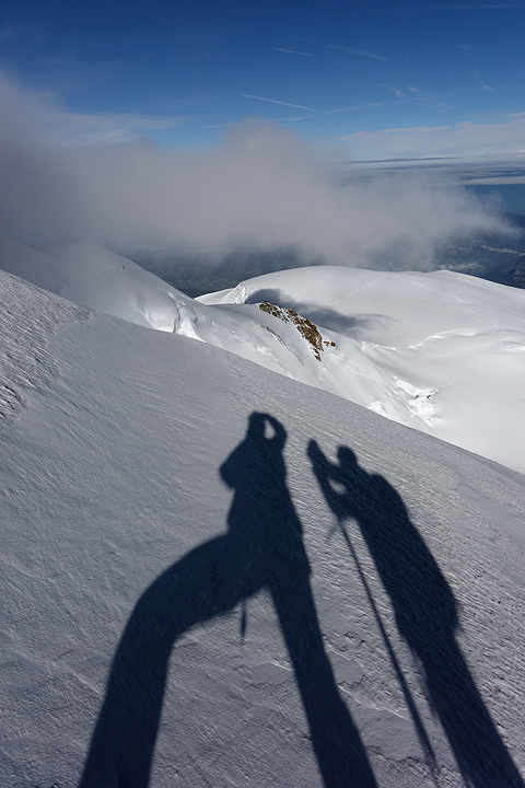 Looking back towards Mont Blanc du Tacul, left, foreground. The Grandes Jorasses is the big peak sticking up out of the cloud on the right. |