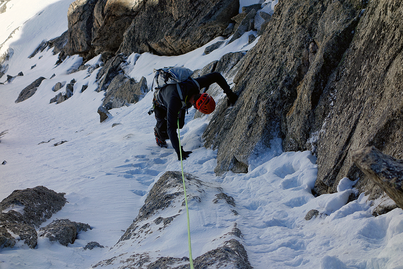 New snow from the previous evening made the upper rocks of the descent more amusing. |