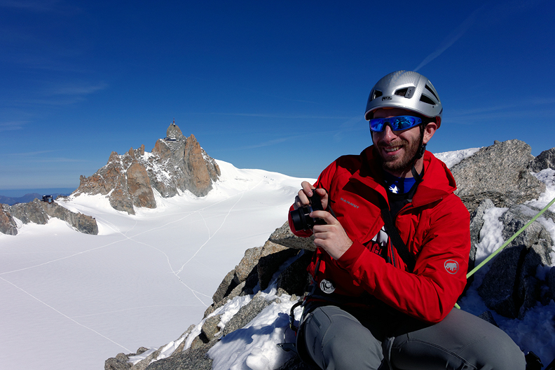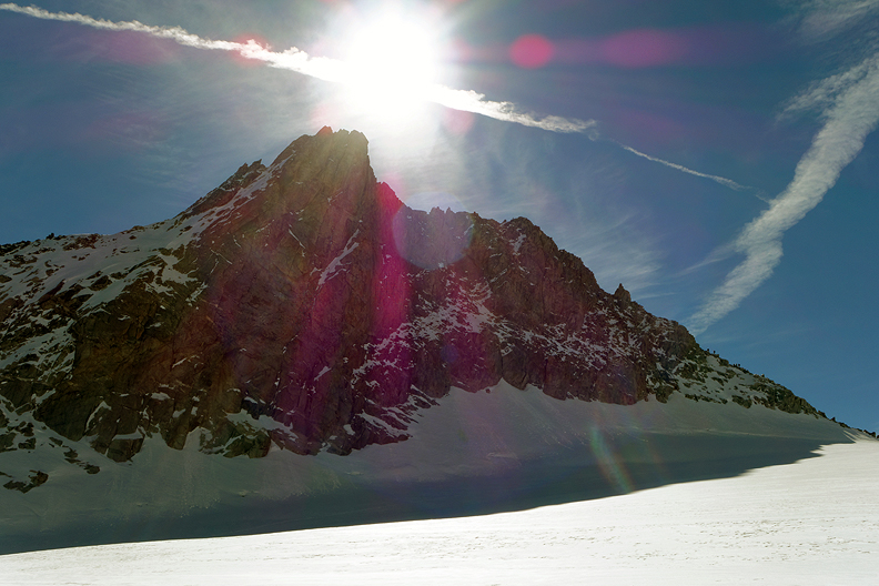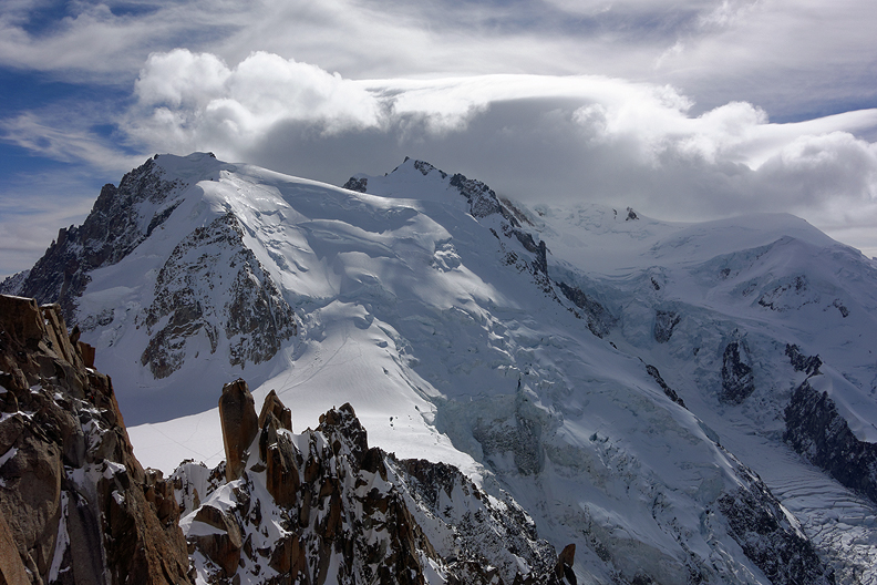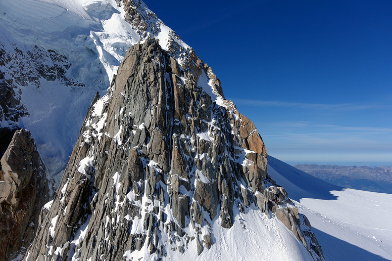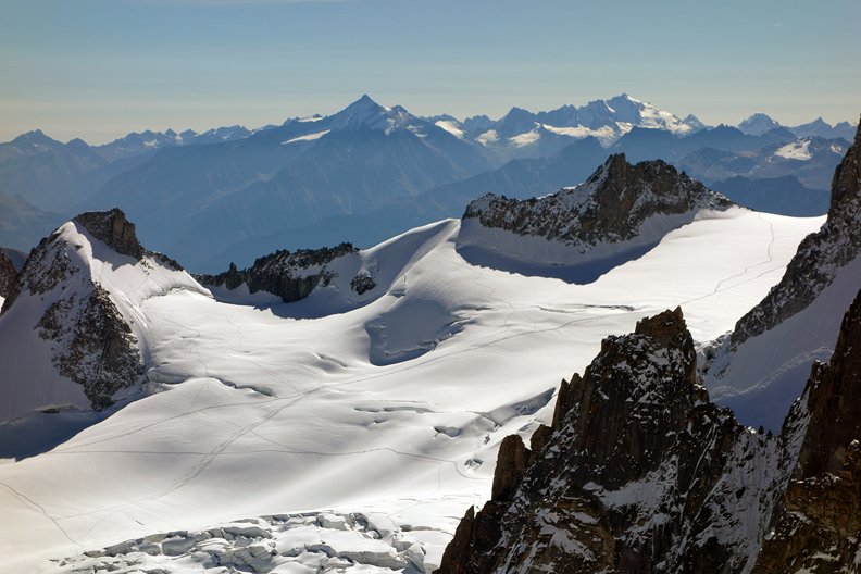 Back at the Aiguille du Midi, some hours later, I took this photo which shows the Triangle, on the left. Mouse over to see the line. |