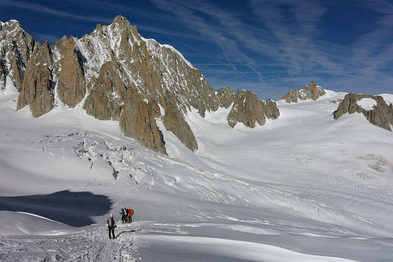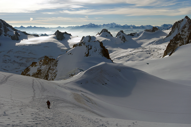 The view looking back to the north and the Aiguille du Midi, taken on our way to the Entreves. |