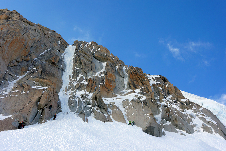 Day three, the Goulotte Chere on the North Face Triangle of Mont Blanc du Tacul. The route is up the obvious ice gully. We climbed the first 4 pitches (the best of the route), then rappeled down. |