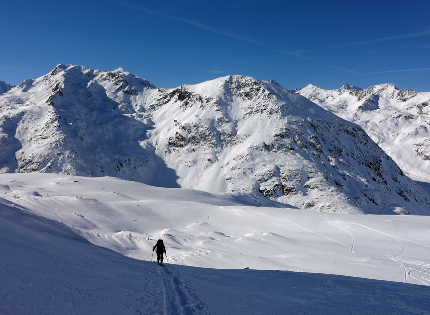 Heading up the ever-steepening slopes that lead to the Col Sud de Menouve, and the border with Italy. Behind is the Pointe des Lacerandes on the right, and the Grande Chenalette on the left. |