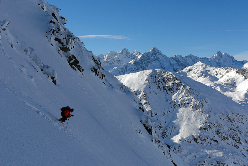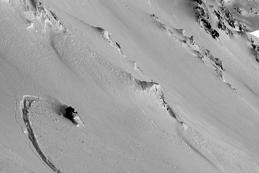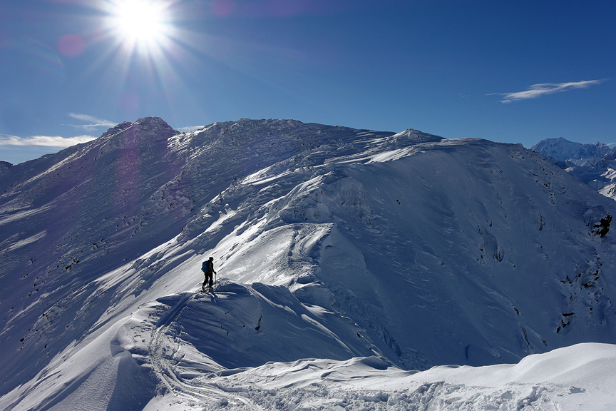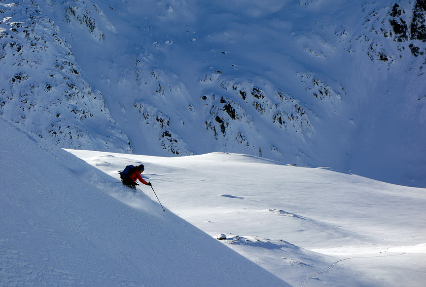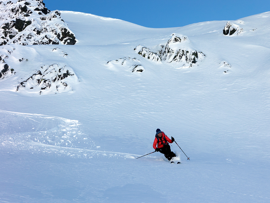 Skinning along the convoluted summit ridge of the Tête Rouge. Just up ahead is where we dropped in, down right. |