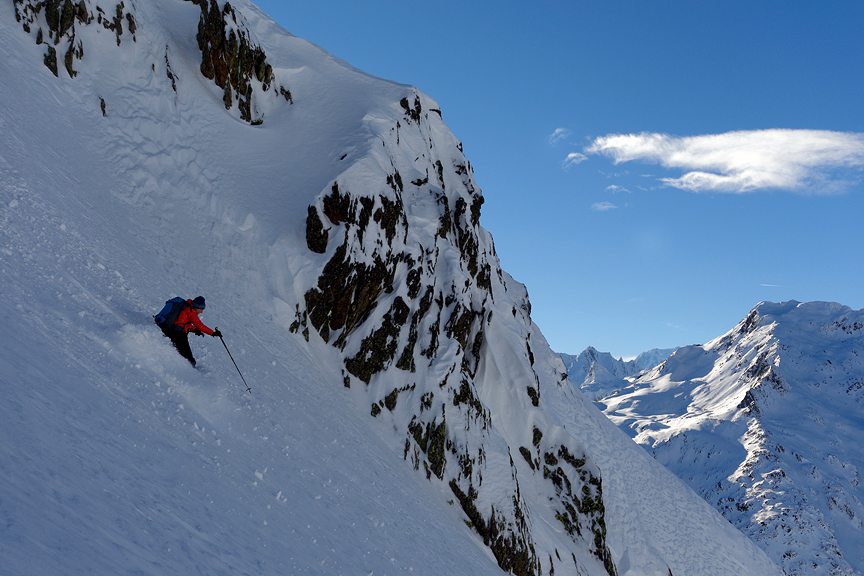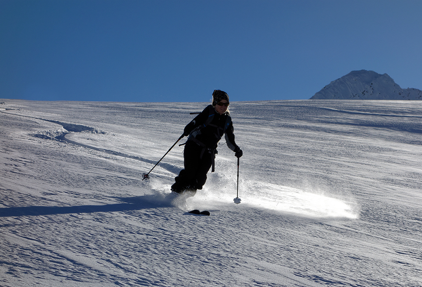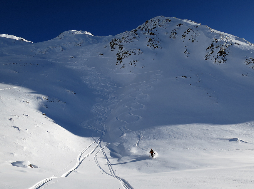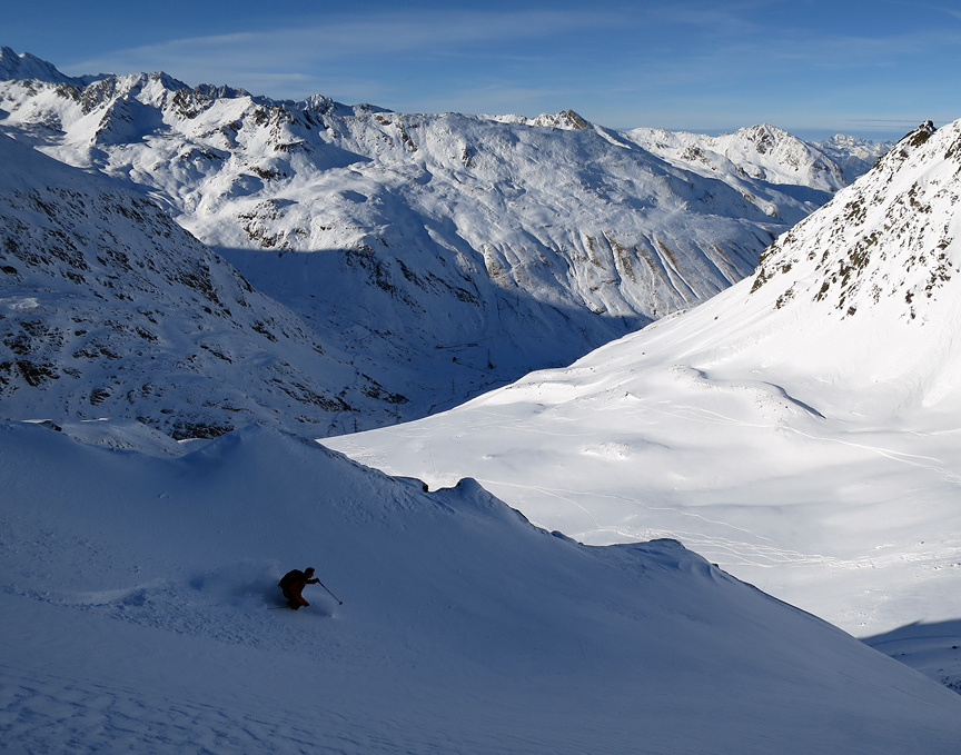 Our first day skiing (pics here) was so good that we couldn't stay away. The Tête Rouge, a small peak on the Swiss-Italian border, just east of the Grand Saint Bernard Pass, looked like it would offer a fine north-facing fun-fest. |
