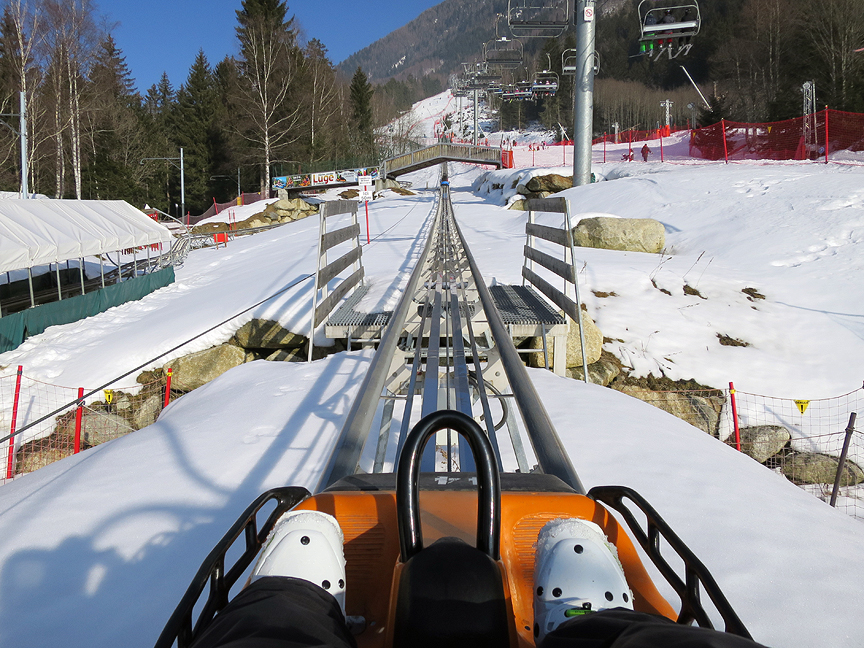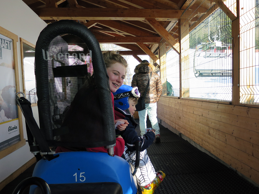 After skiing down the last trail and piste to town, Millie and Bertie show Kathy the ropes on the Alpine Luge |