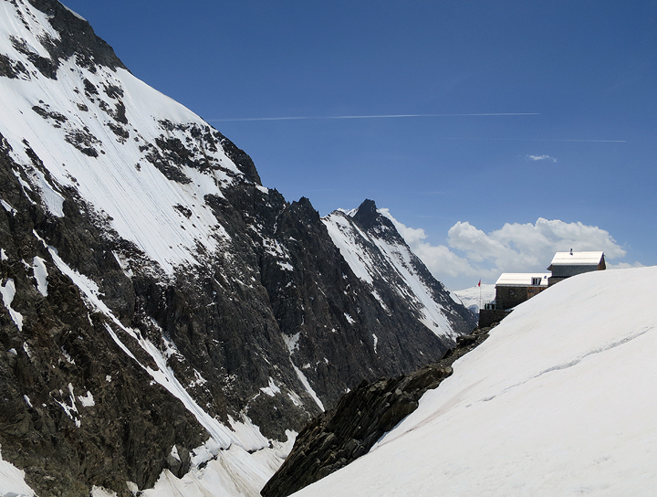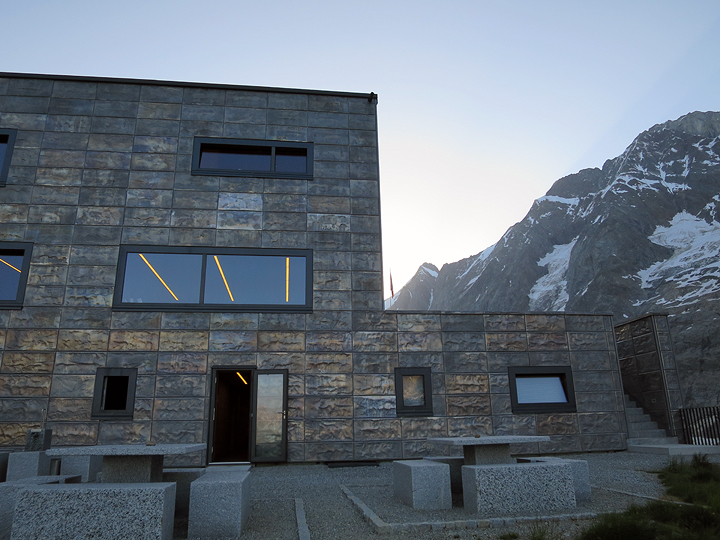 I have several photos of this unusual "hut" (more of a luxury hotel with a strenuous if short hike in as its only access). One of a new generation of mountain huts or lodges designed to be as efficient and self-sustaining as possible, the innovative design also stands out. Insulated aluminum panels are designed to mimic the look of rock. |