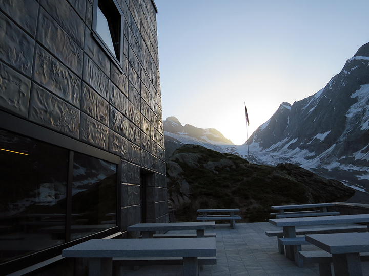 The terrace of the Finsteraarhorn hut in early morning. |