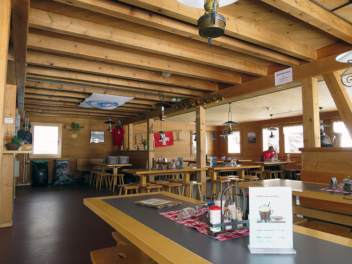 The Mönchsjoch hut, the interior of a well-maintained hut in a quiet afternoon moment between busy lunchtime and dinner. |