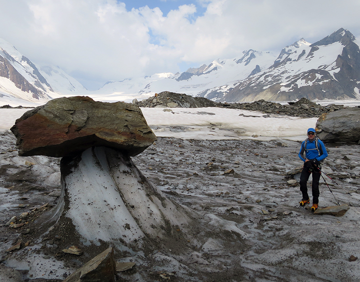 The next morning eventually cleared off however, as Kathy and Dana descended to the Konkordiaplatz and up over the Grünhornlucke. Near the Konkordiaplatz, boulders temporarily insulate and slow the process of ice melting below, forming these fascinating pedestals. |