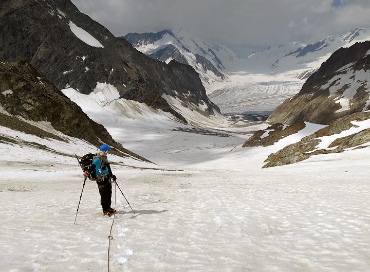 On the snows of the Kanderfirn, with our first hut, the Mutthorn hut, already behind us. This photo was taken on day 2, as we crossed the Petersgrat en route to the Lotschental. |