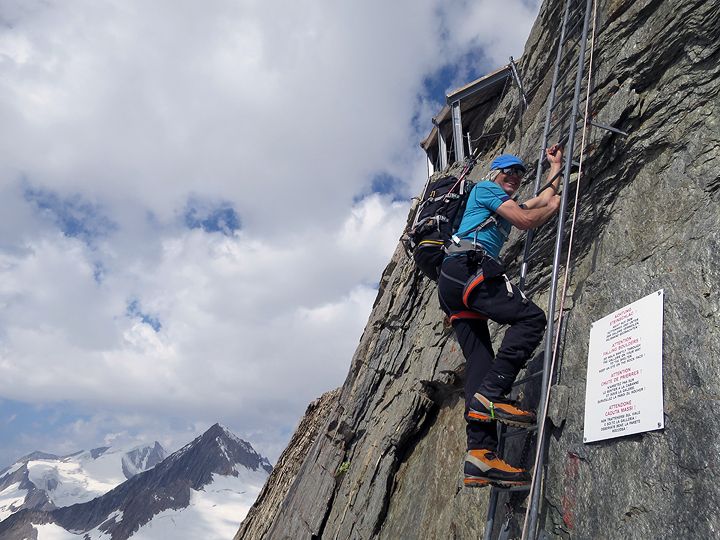 Our day 6 was brutally hot and hazy, hence few pictures of the day's march, but Kathy couldn't resist capturing Dana's hamming it up on the ladders to the Oberaarjoch hut. |