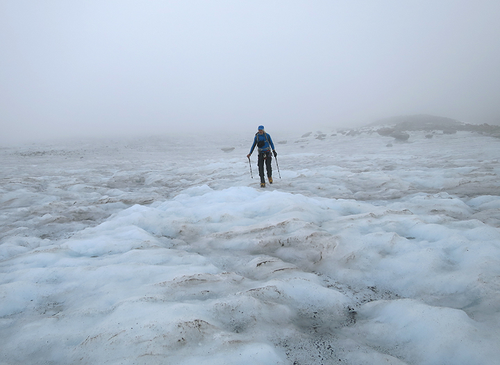 Our descent of the glacier took us into a thick fog bank, where the world suddenly became rather lonely on our sea of ice. |