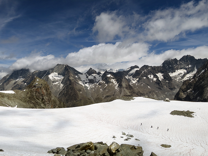 Unfortunately, the clouds were clinging to the top of the Pigne d'Arolla, our high point of the trip, so views were only of fog, but we still enjoyed the accomplishment. |