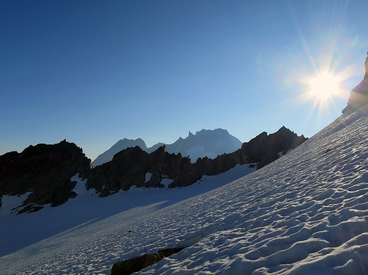 The following morning, day 5, was our "rest and recovery" day. We descended to the village of Arolla to check into a hotel and enjoy a shower and a night in a proper bed. The sun rose brilliantly as we descended. |