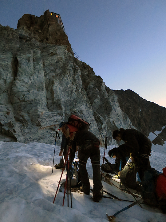 The following morning our long "crux" day begins before dawn, with the descent of the ladders onto the glacier. The lights of the hut look especially cozy as we set off. |