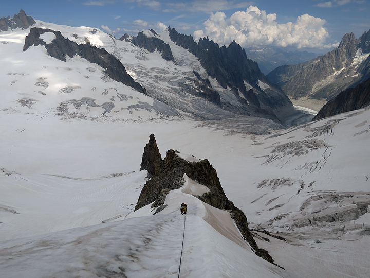 The snow was very sloppy and bridges over crevasses not to be trusted, but we ultimately found our way safely onto the North Ridge of the Petit Flambeau. Larry following up the exposed ridge crest. |