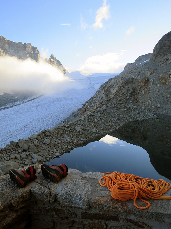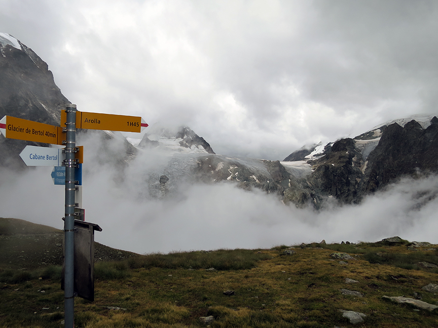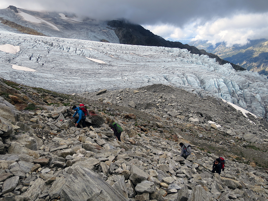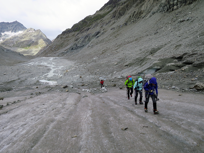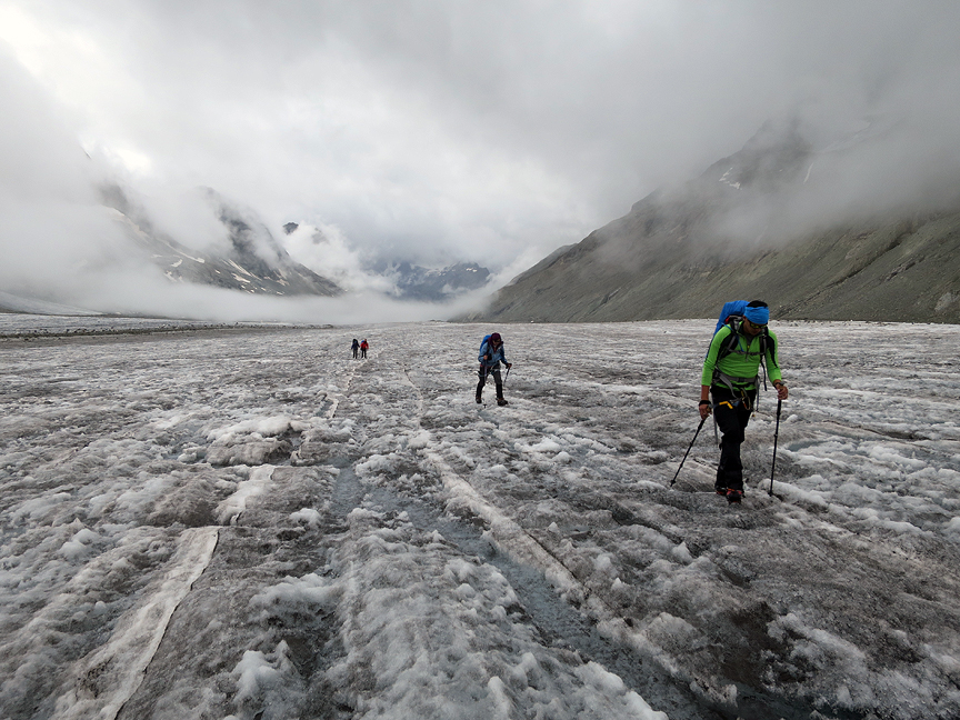 The next day was forecast to be rather rainy. That, and some temporary health issues had us changing our plan and heading to the Vignettes hut directly, via the Otemma Glacier. Leaving the hut in the damp morning. |