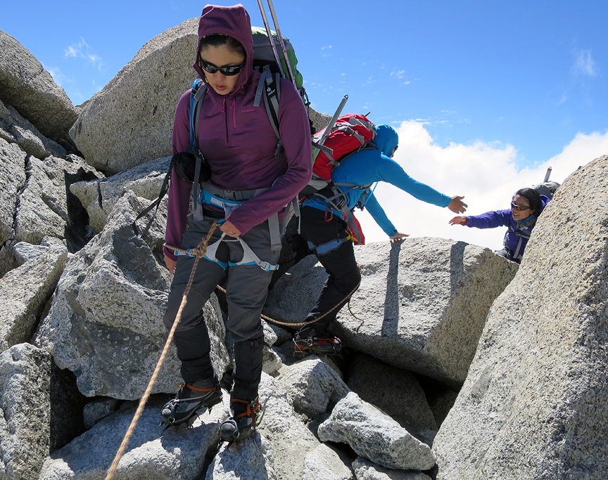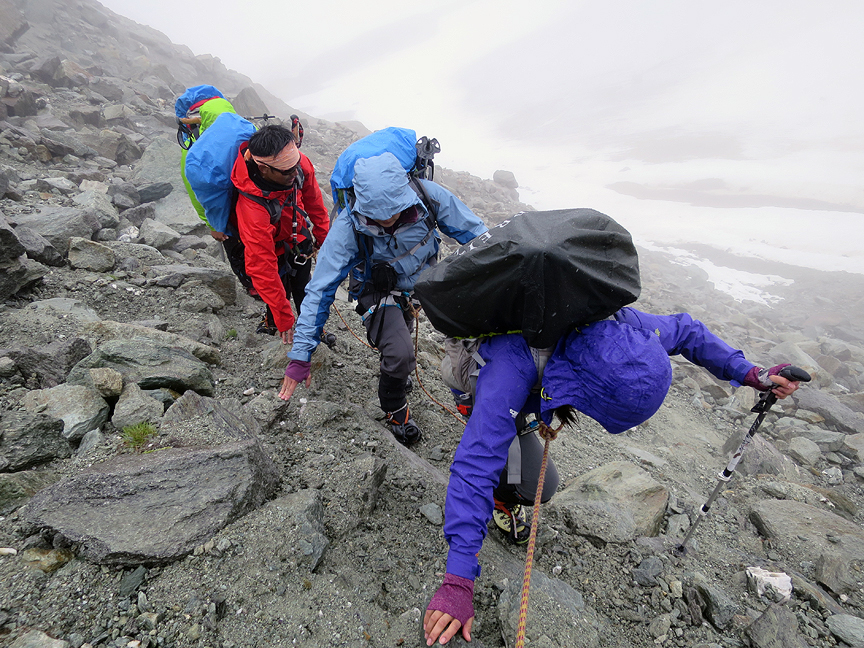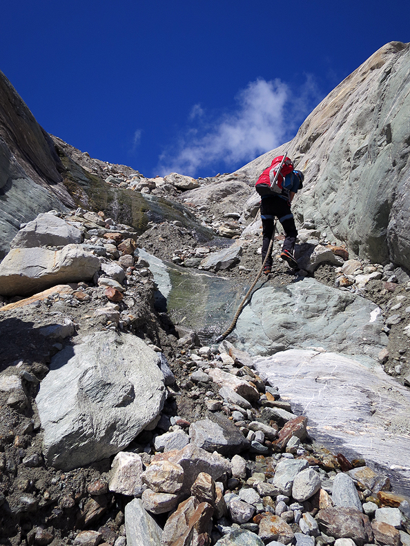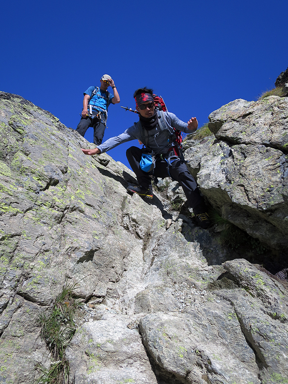 Once off the glacier, we have some steep rock to negotiate on the "Stockji"... |