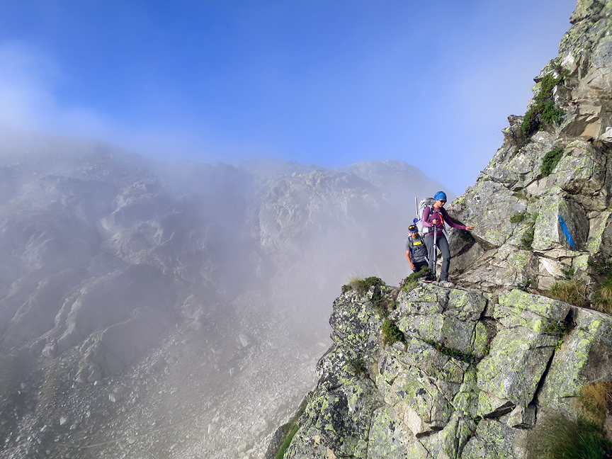 The hike down from the hut is quite exposed in places, the fog mercifully hiding most of the drop below. |