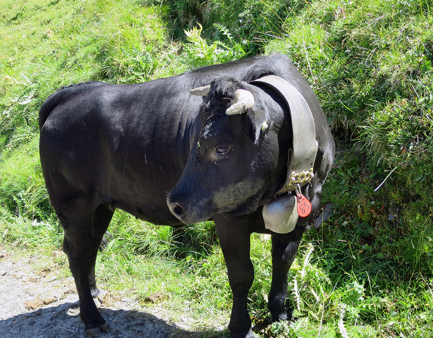 The second half of our day was spent hiking up from the Mauvoisin dam to the Chanrion hut, through lush meadows which we shared with a large herd of these ladies, the famous "fighting cows" of the Alps. Although lean and mean, these combative cows are not aggressive to humans. This one seemed positively bored by our presence. Still, their sheer numbers and size were nevertheless a bit intimidating as cautiously pushed our way through the herd. |