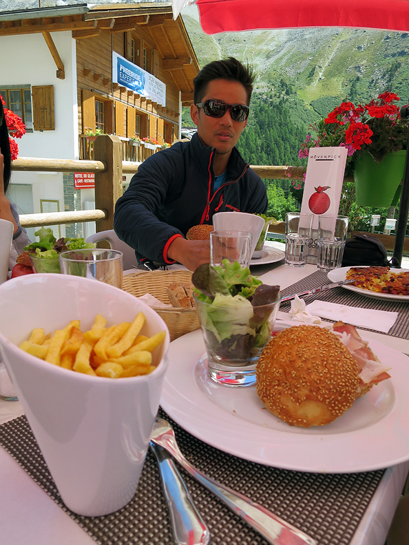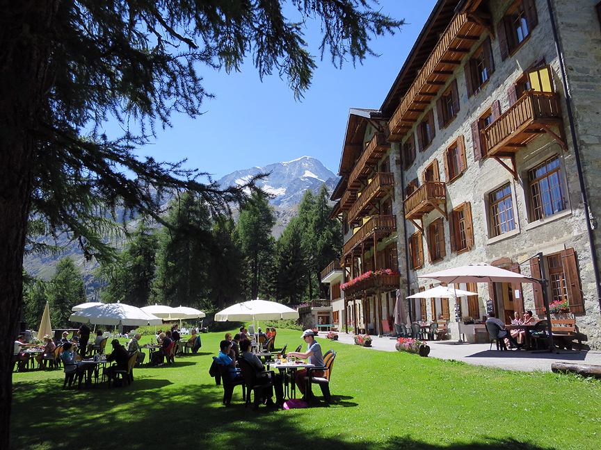 Kathy's favorite hotel, the Kurhaus, looks especially inviting on this sunny day. The view from the garden back up to our "scene of triumph" of the day before, the Pigne d'Arolla gleaming above. |