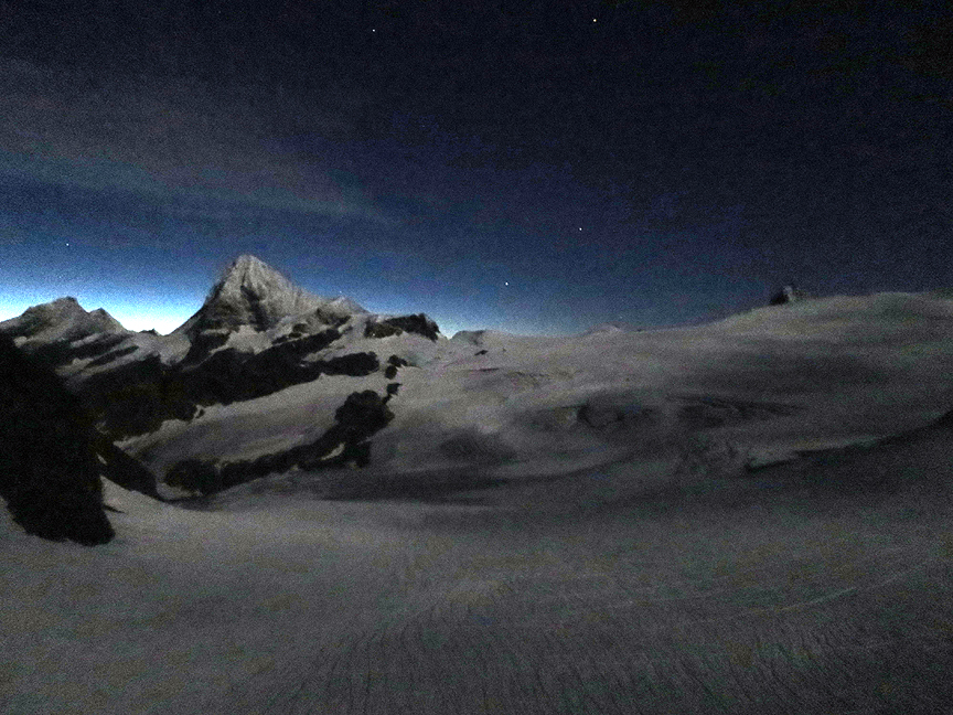 By dawn, the skies were clear once more, and the mountains glowing in the light of a full moon. |