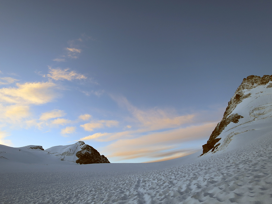 Sunrise pinks up the cloud as we work our way up the glacier. |